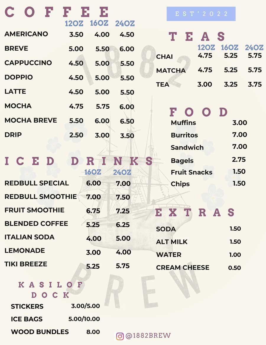 At the heart of Kasilof Dock RV Park is our in-park coffee shop, 1882 Brew. Here, you can savor a hot cup of coffee or a refreshing cold drink, while taking in the scenic views of the Kasilof River. Our menu is designed to cater to diverse palates, offering everything from classic espresso drinks to creative redbull infusions and smoothies.